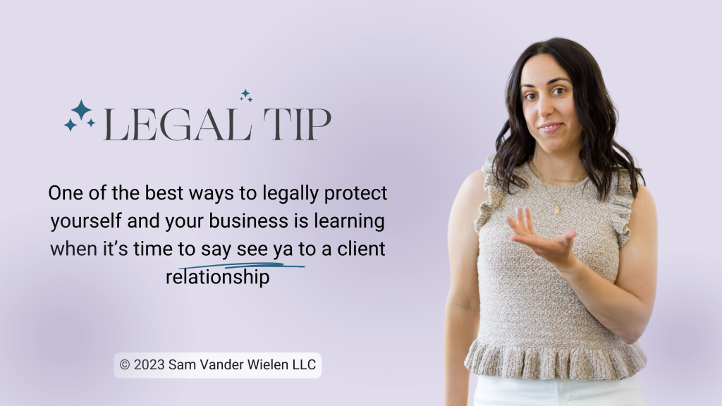 One of the best ways to legally protect yourself and your business is learning when it’s time to say see ya ???? to a client relationship. Actually, I think it’s THE best legal tip I can give you. (Actually, the ultimate best legal tip is to try to avoid problem clients, which I teach you how to do inside the Ultimate Bundle® — but after that, this is the next best legal tip).